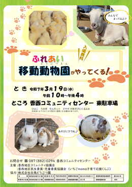 3月19日(水)10時〜16時 香西コミュニティセンター東駐車場にかわいい動物たちがやってきます!! 遊びに来てください。 |