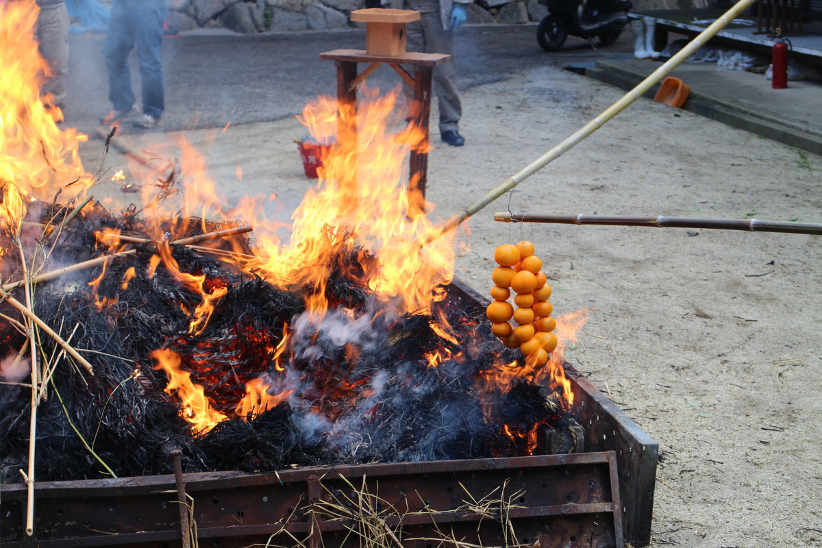 12月9日(土)宇佐八幡宮で庭燎祭(みかんやき)が行われました 9時からの祭典に引き続きおひたき開始、古いお札等を焼いた火でみかんを炙って食べると風邪をひきにくいそうです。 |